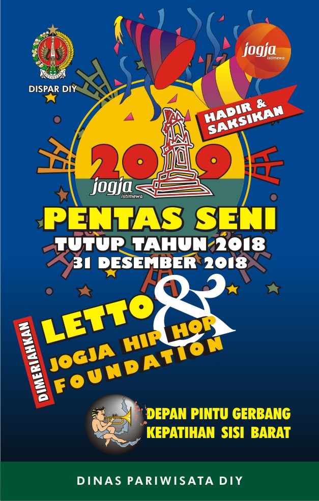 Pentas Seni Tutup Tahun 2018Sabtu, 31 Desember 2018Depan Pintu Gerbang Kepatihan Sisi Barat Dimeriahkan oleh Letto & Jogja HIP HOP Foundation Sumber: Seksi Pelayanan Informasi Pariwisata, Bidang Pemasaran, Dinas Pariwisata …