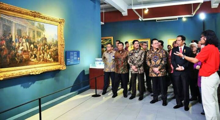 Mikke Susanto, penulis resensi yang juga sebagai kurator, tengah memberi informasi kepada Presiden Joko Widodo dan tamu lainnya tentang lukisan Penangkapan Pangeran Diponegoro karya Raden Saleh di Galeri Nasional Indonesia, Jakarta, pada saat pembukaan Pameran Koleksi Istana Presiden RI ”17/71 Goresan Juang Kemerdekaan” (1 Agustus 2016).