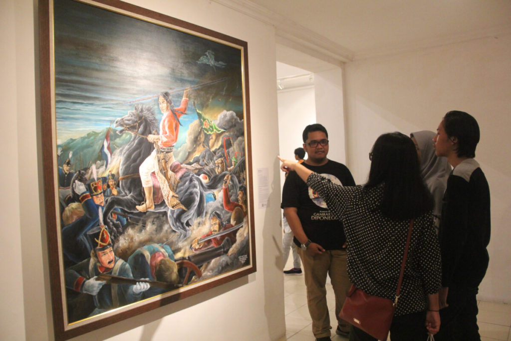 Pengunjung melihat-lihat lukisan yang ditampilkan dalam Pameran Sastra Rupa ”Gambar Babad Diponegoro” di Jogja Gallery, Yogyakarta, Jumat (1/2/2019) malam. Pameran yang berlangsung 1-24 Februari itu 51 lukisan yang dibuat berdasarkan kisah-kisah yang ada di dalam Babad Diponegoro.