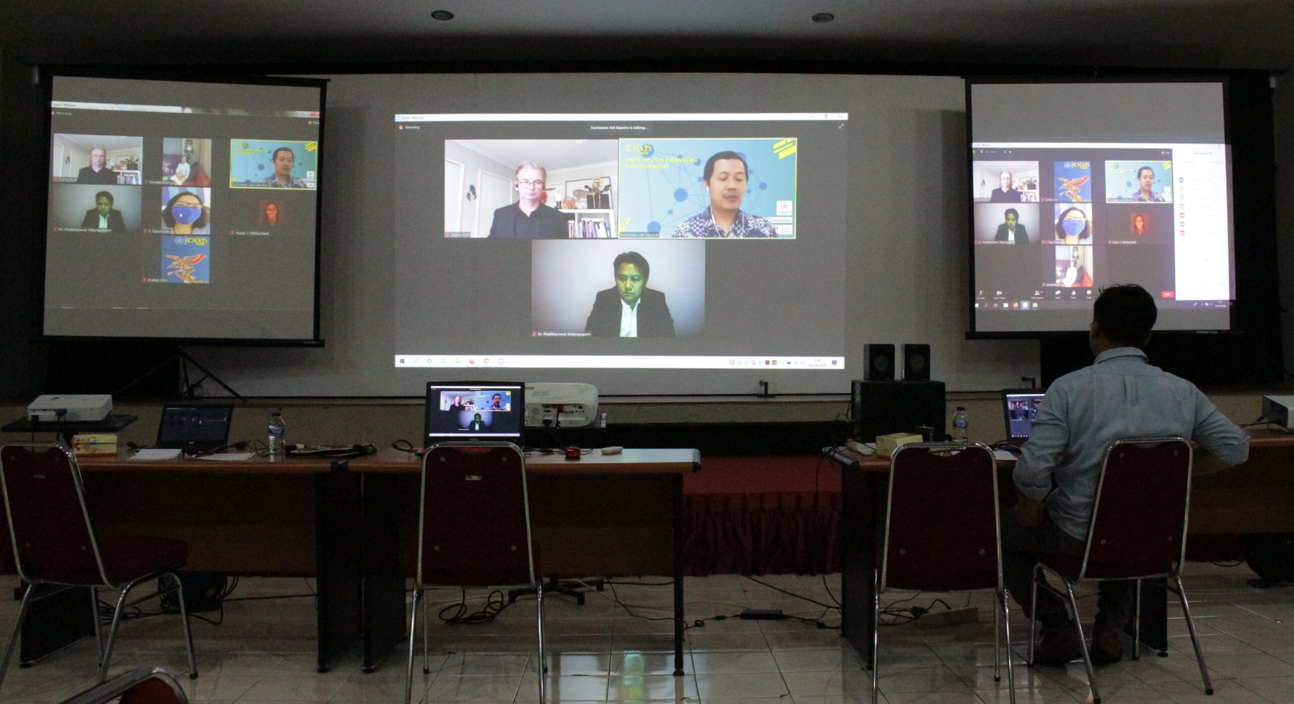 Webinar yang mengusung tema “Arts in Our Changing Environment” ini berlangsung selama dua hari yaitu pada tanggal 14-15 Oktober 2020. ICAPAS 2020 menghadirkan keynote speaker dari dua negara berbeda dan merupakan pembicara yang kompeten di bidangnya yaitu Dr. Danny Butt berasal dari University of Melbourne, Australia serta Dr. Phakharawatt Sittiprapaporn, Ph. D. yang berasal dari Brain Science and Engineering Innovation, Mae Fah Luang University, Thailand. Diawali dengan Keynote Speech berjudul “Deinstitutionalising The Archipelagos of Artistic Research” milik Dr. Danny Butt dan dilanjutkan dengan keynote speech dari Dr. Phakharawatt Sittiprapaporn yang berjudul “Neuroscience of The Arts: Challenging In New Normal Education Program”.