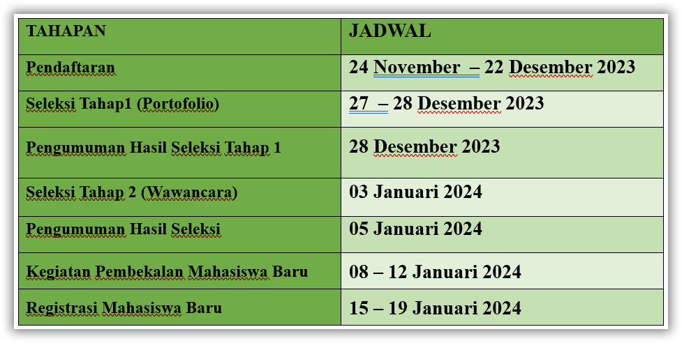 - Portofolio Seni berupa karya seni yang telah dihasilkan bagi pelamar minat penciptaan dan pertunjukan seni, atau karya ilmiah yang telah diterbitkan bagi pelamar minat pengkajian seni (minimal 2 buah dalam 3 tahun terakhir).